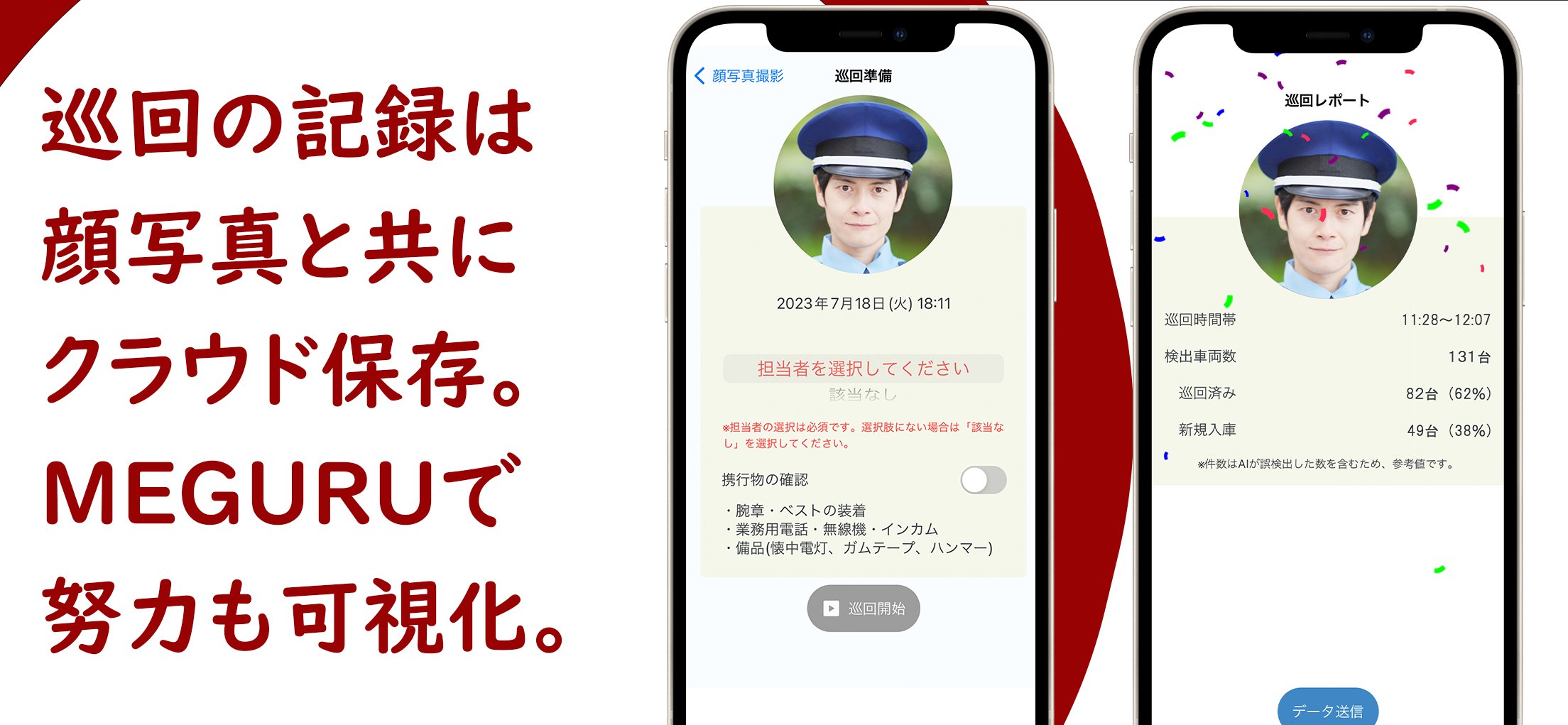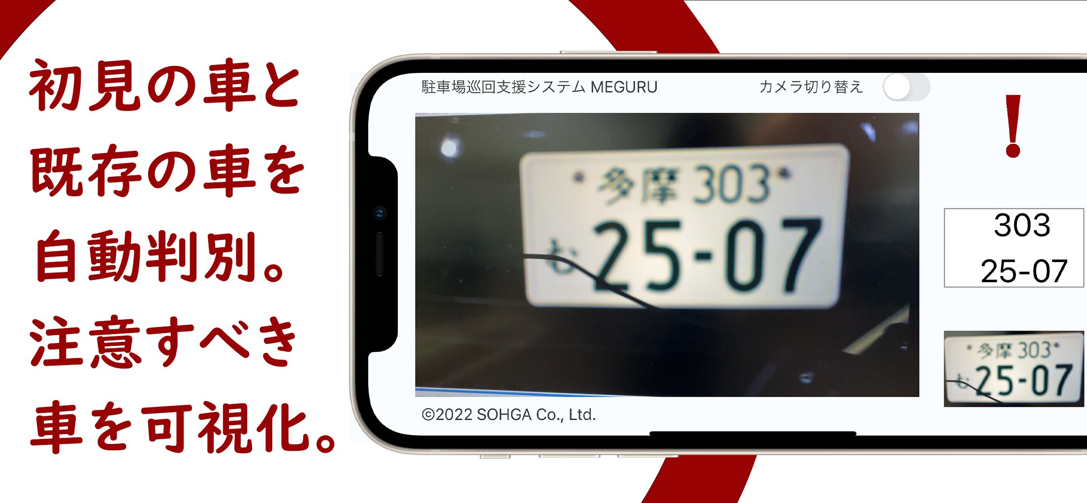 「MEGURU」は、AI画像認識アプリをインストールしたスマートフォン(iPhone12)で、駐車車両のナンバープレートを撮影、読み取った番号を蓄積・照合し、車内の確認済みと未確認車両を特定することで、遊技場などの駐車場巡回員の疲労による肉体的かつ精神的な負担を軽減、巡回時の車両確認の水準の底上げや正確性を向上させ、巡回や車内確認の時間を短縮し、子どもの置き去り事故を未然に防ぎ、対策を徹底的に強化するシステムです。